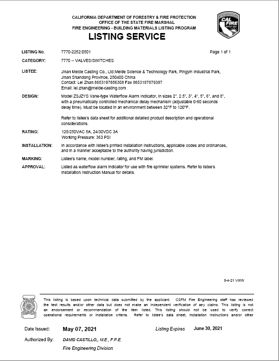 MEIDE GROUP’s water flow indicator (ZSJZYS) has got CSFM certificate.