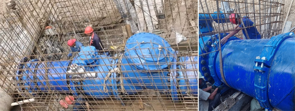 在施工過程中,玫德的工程師團隊深入施工現場,與施工單位緊密合作,嚴格把關安裝規范,確保每一個接口的關鍵參數符合規范。最終項目順利通水,這標志著大口徑鋼管溝槽連接方案在閥門井場景中成功應用!